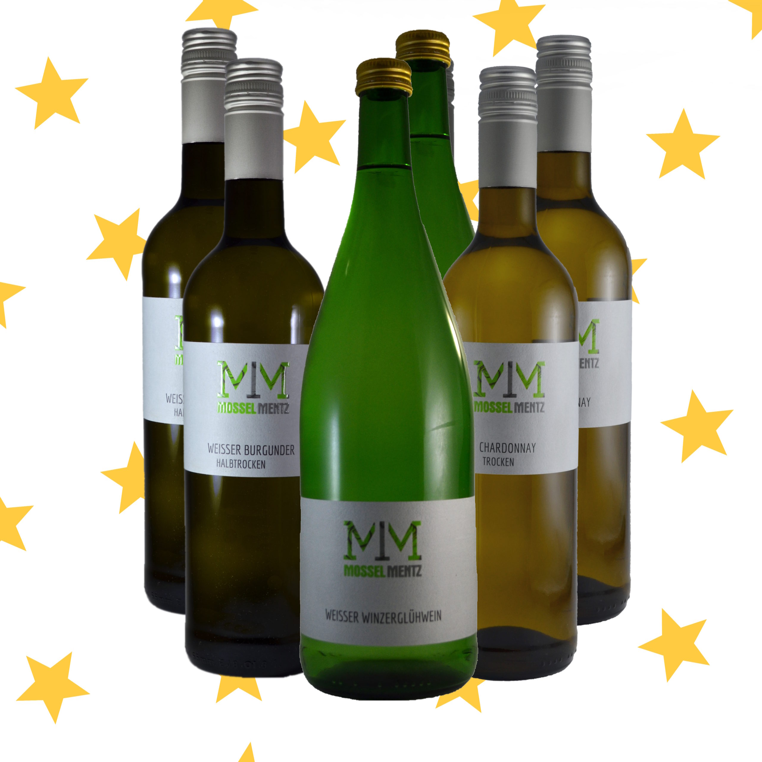 2 Fl. Weisser Winzerglühwein(11,5% Vol. Alk), 2 Fl. Chardonnay trocken(12,5% Vol. Alk), 2 Fl. Weißer Burgunder halbtrocken(12% Vol. Alk)